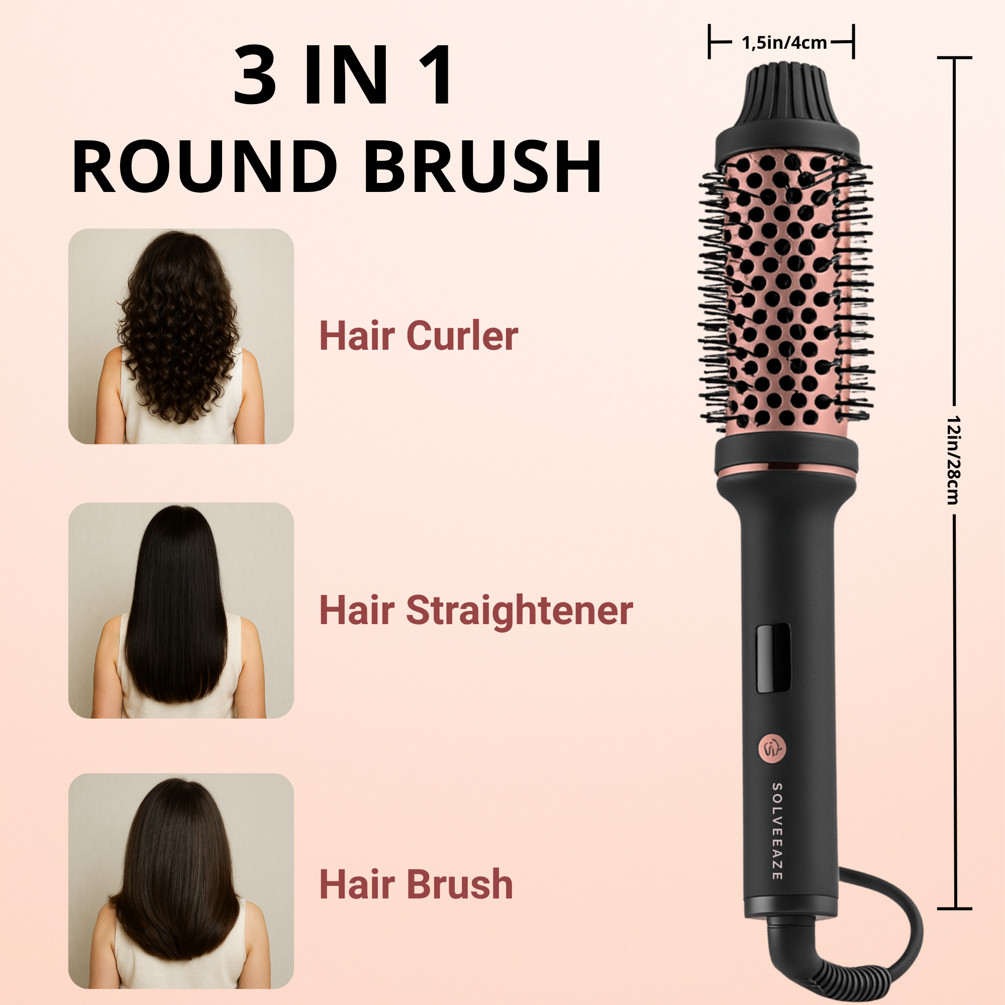 The 3-in-1 Round Brush is your all-in-one styling tool, combining a curler, straightener, and brush in one.